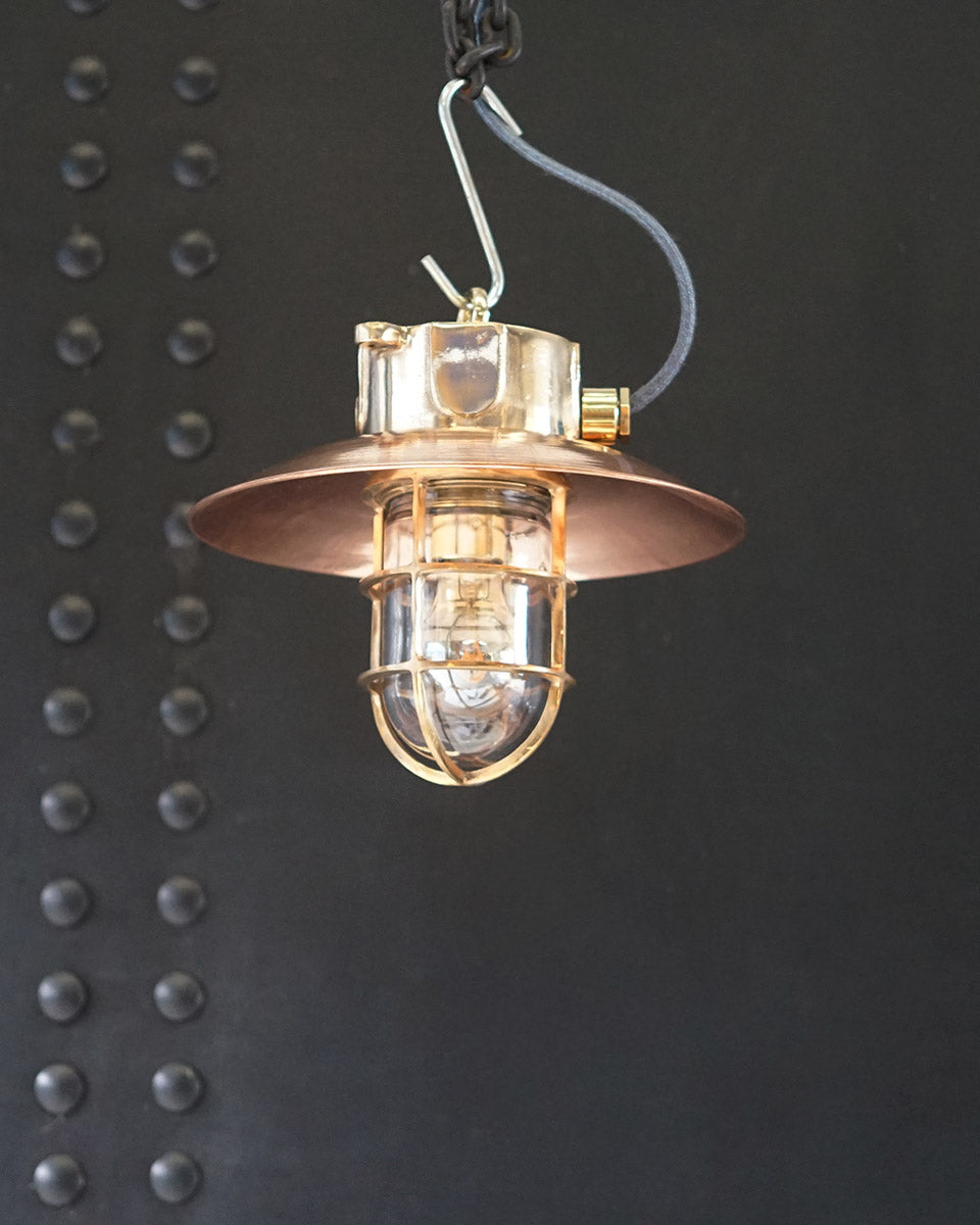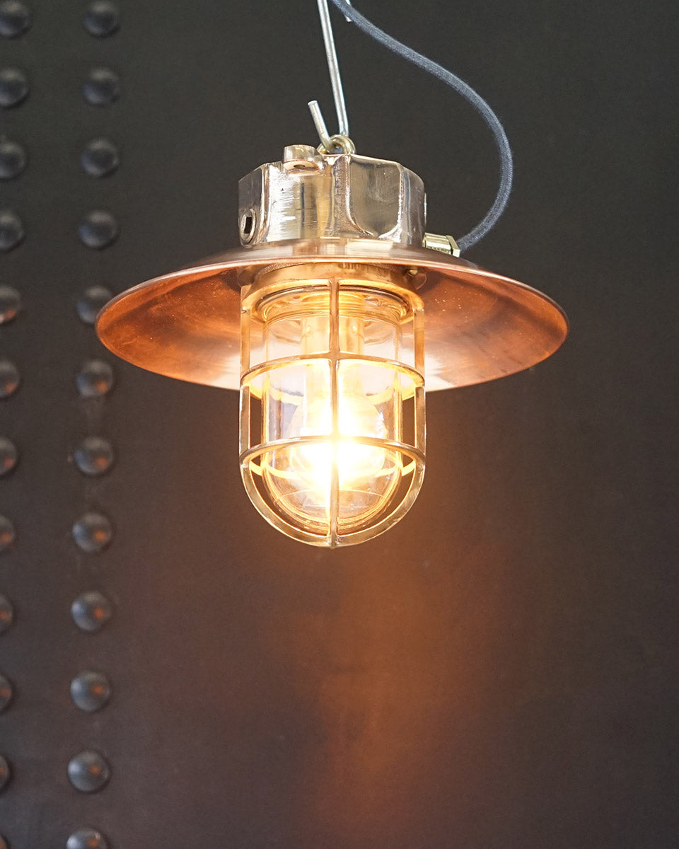 An original passage light salvaged from MV Neptune 1. Adapted by us into a striking pendant light of brass & copper. These lights are the perfect size for home & retail interiors. Suitable for a whole host of interior decors, they are a true example of elegant marine fittings. All these lights are different and vary, longer shorter cages, we would not be able to matching an identical matching pair, which we believe adds to the charm.