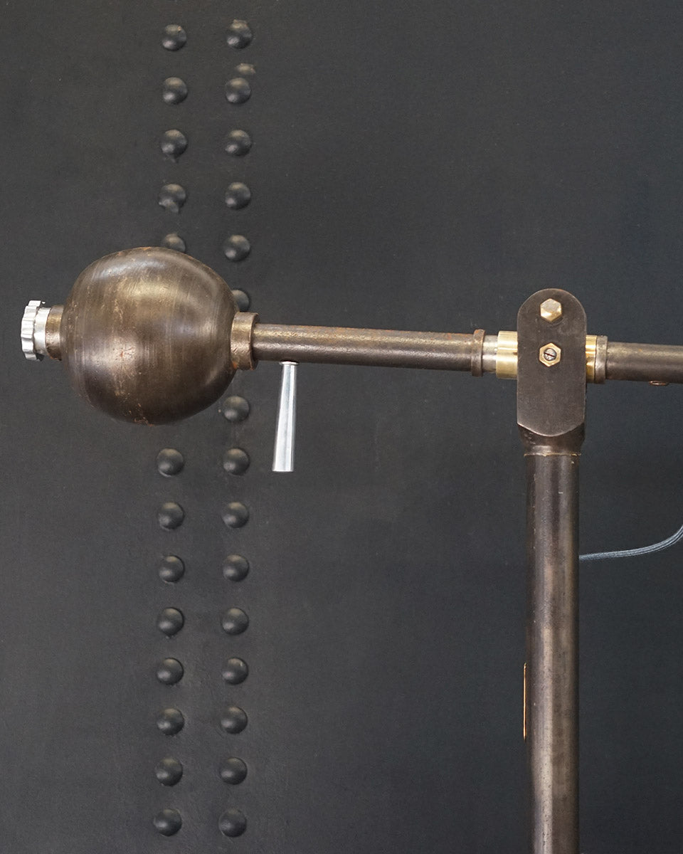 Originally painted but that had deteriorated so we stripped that back for the industrial look. The lamp head is adjustable via the toggle at the rear of the boom, and the boom swings on both axis freely balanced by the counterweight at the rear. Brass switch on the stem of the lamp operates the lamp. It comes fully wired with E27 fitting and standard E27 screw bulb.